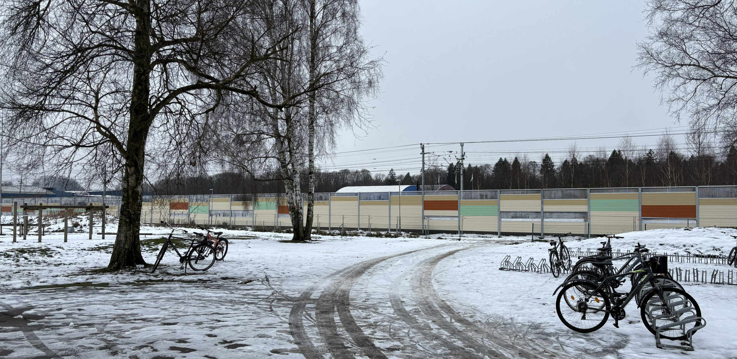 Den nya ljudreducerande bullerskärmen i Älmhult är nu färdigbyggd och står klar för slutbesiktning. Projektet har genomförts för att förbättra ljudmiljön i området, särskilt genom att dämpa buller från tågtrafiken som tidigare påverkat närmiljön kring Linnéskolan.